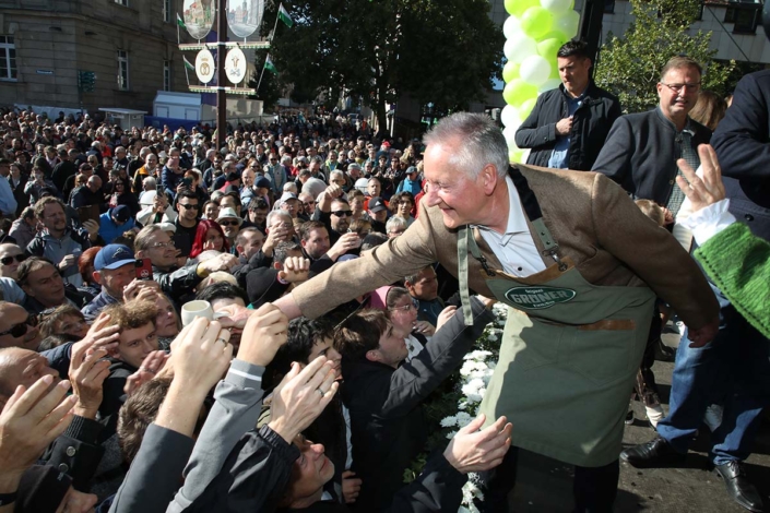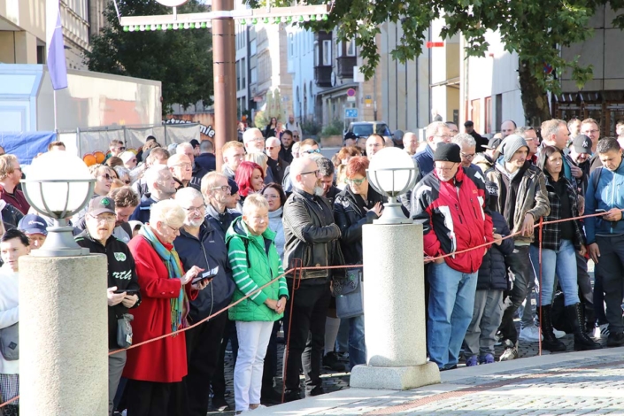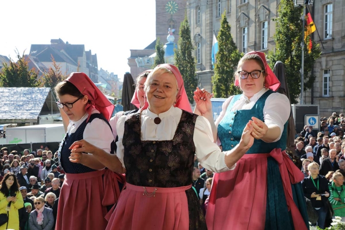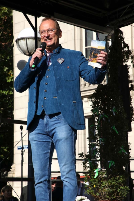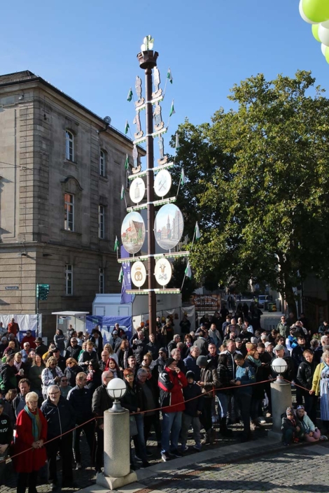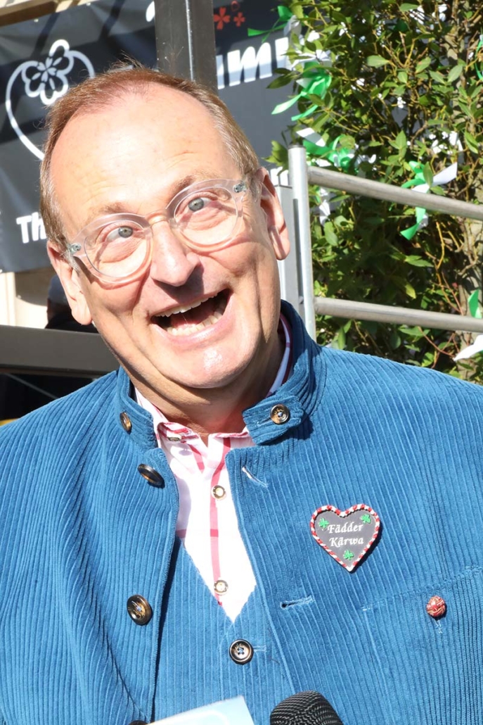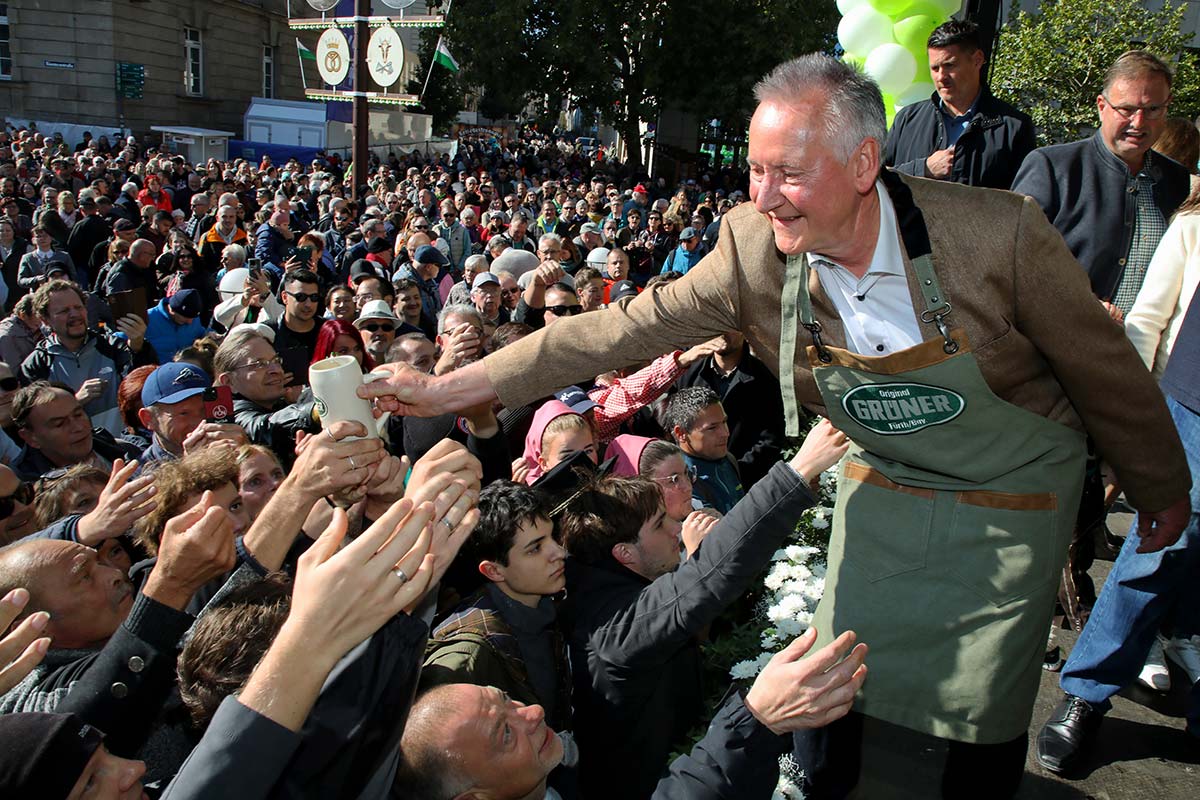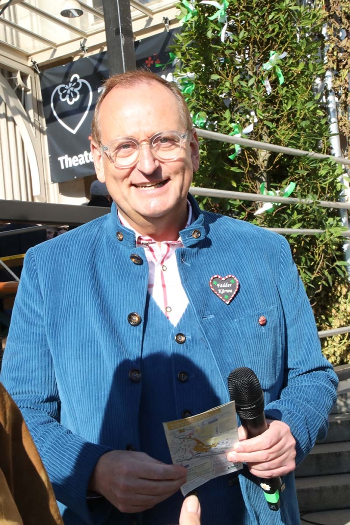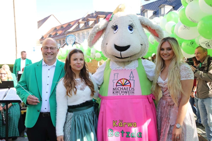 Strahlende Gesichter und eine große Menschenmenge auf dem Theatervorplatz: Bei schönstem Sonnenschein startete die Michaelis-Kirchweih am Vormittag des 3. Oktober 2025 – wie gewohnt mit einer Tanzvorführung vom Heimat- und Volkstrachtenverein Stadeln, Blasmusik aus Burgfarrnbach und Moderation von Volker Heißmann. Der städtische Wirtschaftsreferent Horst Müller zeigte sich auch nach über 25 Jahren im Amt wieder begeistert über den „schönsten Job der Welt“ als Kirchweih-Referent.