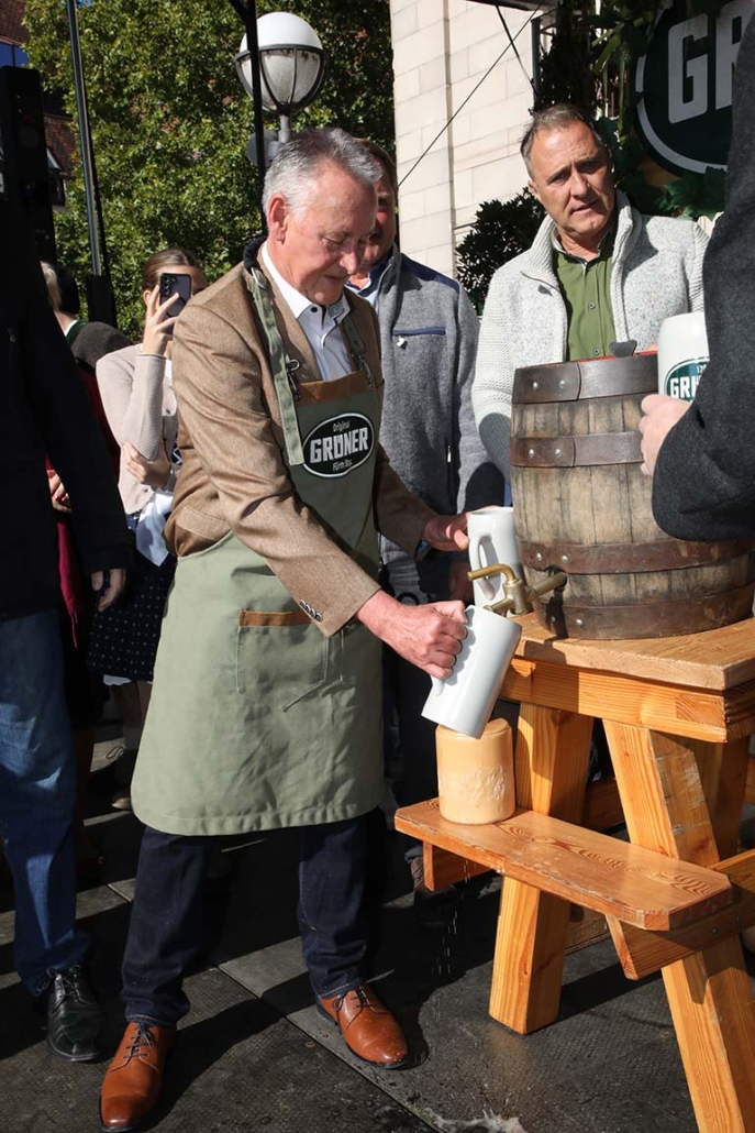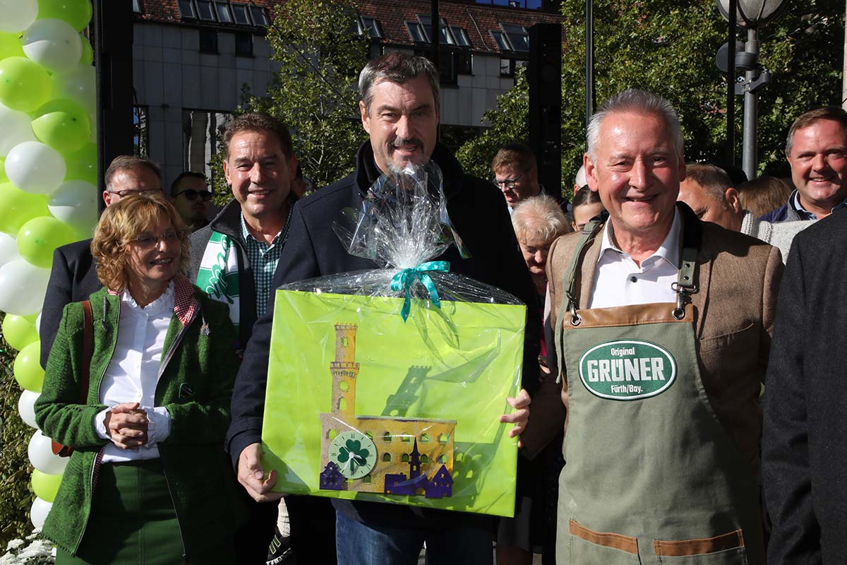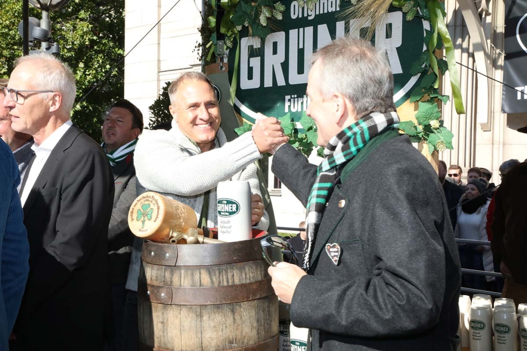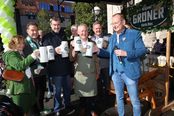 Beim Anzapfen musste OB Dr. Thomas Jung diesmal ein paar Schläge nachlegen – die erste Maß Festbier ging, wie schon im vergangenen Jahr, an den bayerischen Ministerpräsidenten Markus Söder. Ein Geschenk bekam er auch überreicht: Das Fürther Rathaus als Uhr. Söder bezeichnete das schmunzelnd als Fortschritt gegenüber 2024 – da hatte ihm Volker Heißmann das neu eingeführte Bonusheft für WC-Gebühren, genannt „Brunzkärtla“, verpasst.